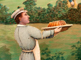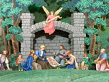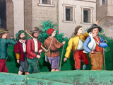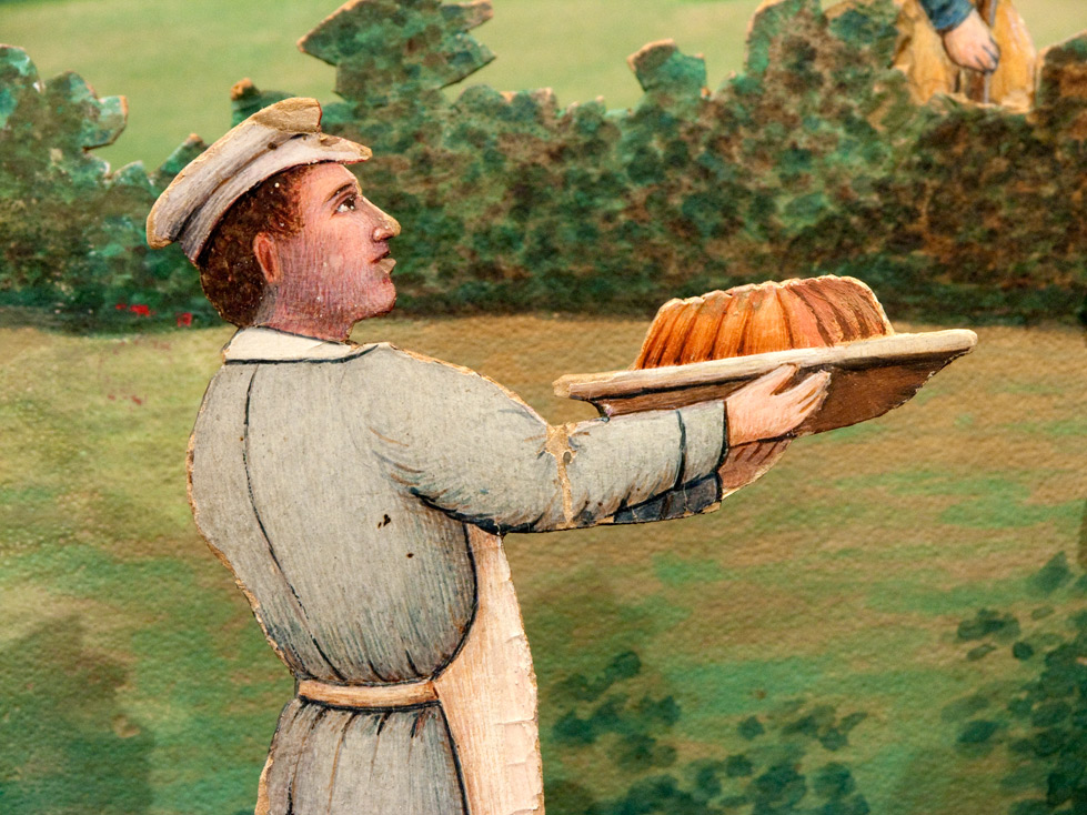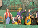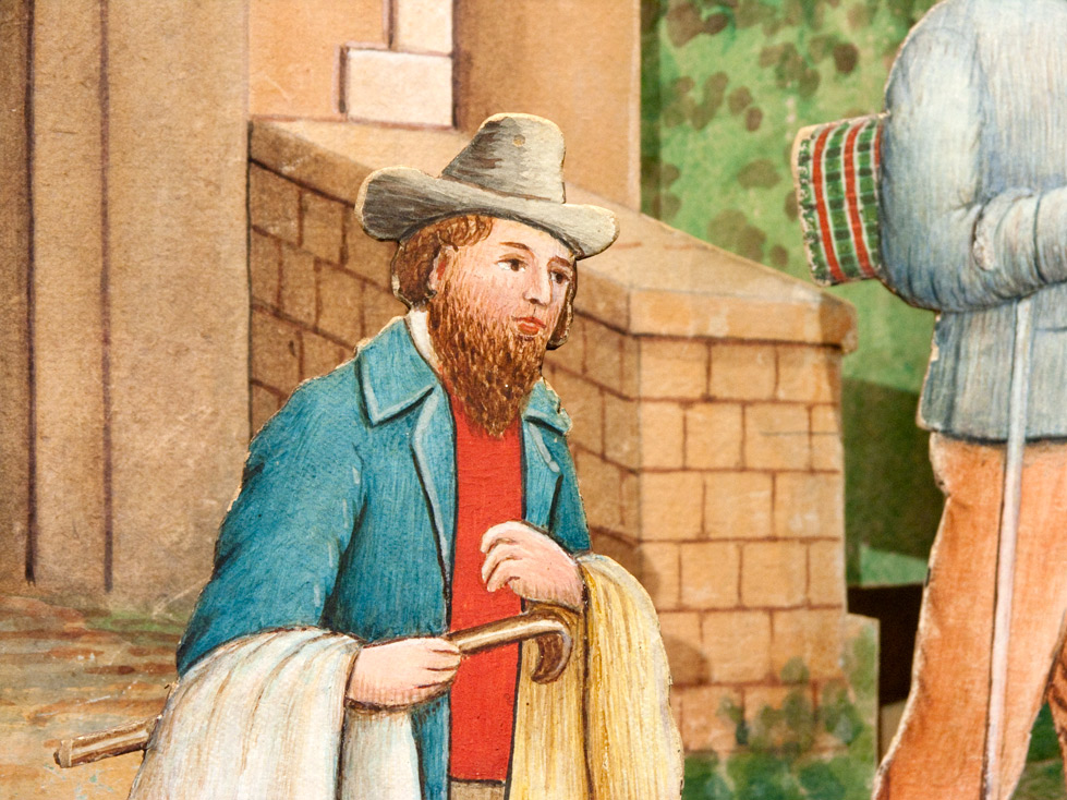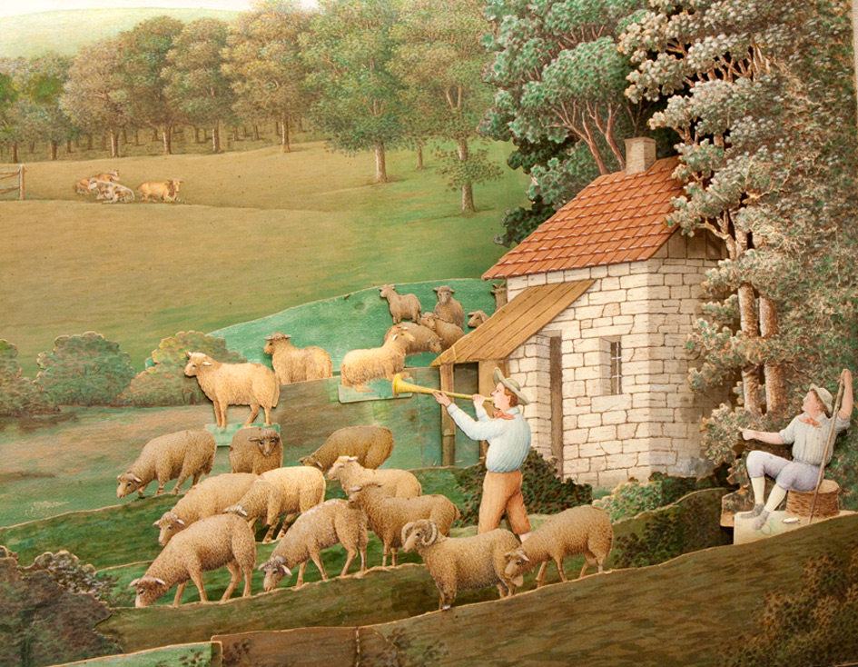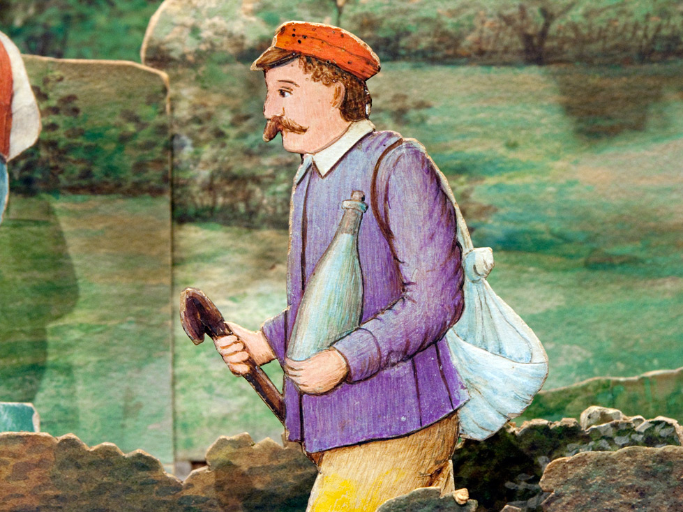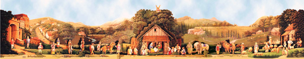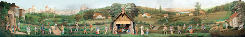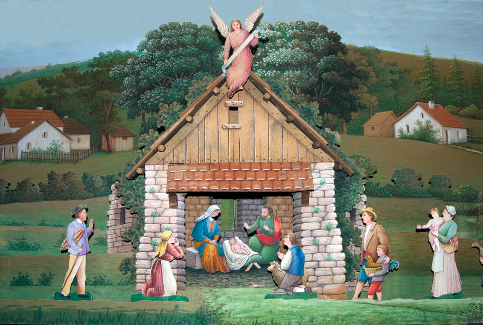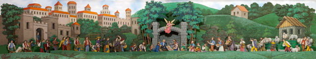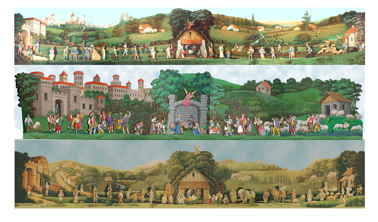 A typical feature in most of Ferdinand’s panoramas is the depiction of pastoral life on one side, with farmers and shepherds bringing their gifts of farm produce to the central manger, and city life on the other, with townspeople bringing presents of bakery products or manufactured goods.