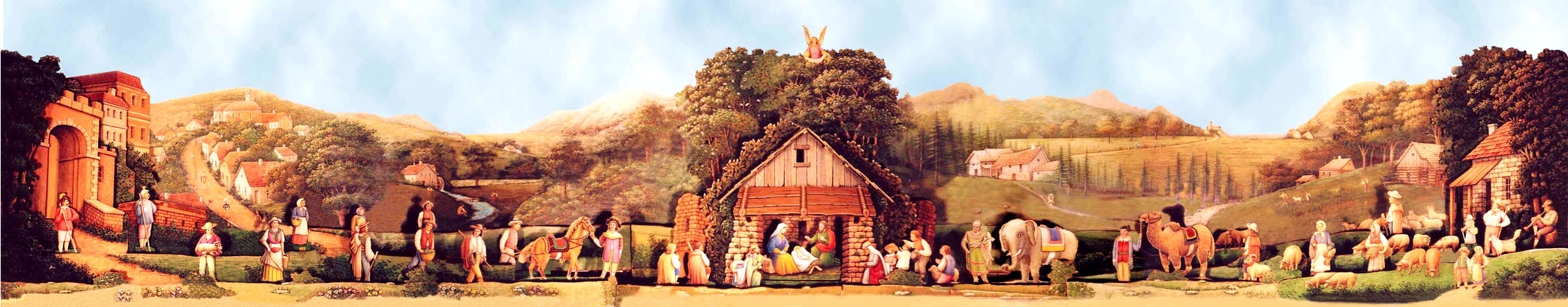 Images of Ferdinand Pribyl's artwork follow, with photographs of three of his Nativity scenes. Below these are a number of landscapes painted by Ferdinand and gifted to family members. Click on any of the thumbnail images to open a larger version of the image in a separate window, and use your browser's Back button to navigate back to this page. These are large images and web browsers will try to fit the image to your screen size, so to see the full-size image, click on the image with the magnifier mouse cursor {}. During the 2015 Christmas season, a talented video artist, Jeff Frownfelter, asked permission to use the three Nativity scenes to produce a video honoring the artwork and the theme of the birth of Christ. Jeff has a website of his work called Sensation Gallery. The beautiful video he produced may be viewed in its first and second renderings on YouTube.