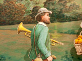 Ferdinand’s extant body of work contains three complete panoramic Nativity scenes, figures from unfinished scenes, and several paintings. The Nativity scenes vary in length between 10’ and 15’, and are over 2’ in height. They are 3-dimensional in effect, with multiple cut-outs of people, animals, and landscape scenes inserted into slots on a 12” baseboard.
