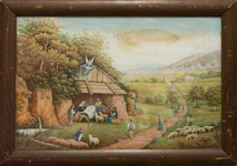 No two scenes are alike and few individual figures are identical. They are painted on salvaged cardboard from commercial products such as oatmeal boxes and packaging for shirts. One reason that they have been so well preserved is that the paint was mixed with Paris green or copper acetoarsenate, an extremely toxic substance, which at that time was used as a pigment, an insecticide, and a blue colorant for fireworks.