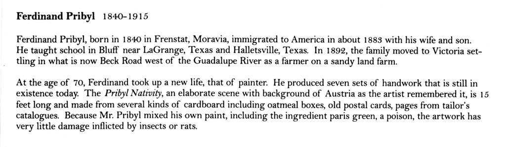 The Stockbauer and Staha Nativity Scenes were displayed in full at The University of Texas Institute of Texan Cultures (ITC) in San Antonio, Texas, during the 2009 Christmas Holiday season. Also included was the manger painting owned by Helen Matrisciani of Houston, Texas, and some nativity figures from the Pribyl Nativity Scene and additional figures owned by Mary Lou Urban. The exhibit was titled, "The Nativity Art of Ferdinand Pribyl", and was open from Nov. 21, 2009 through Jan. 3, 2010. The ITC has a Facebook photo album of the exhibit setup here. An opening reception on Nov. 21 was highlighted by a slide presentation on Ferdinand's life and art by Bette Stockbauer. The curator chose to play "The New World Symphony" by Czech composer, Antonin Dvořák, during the exhibition. A video pan of the exhibition hall may be viewed here.