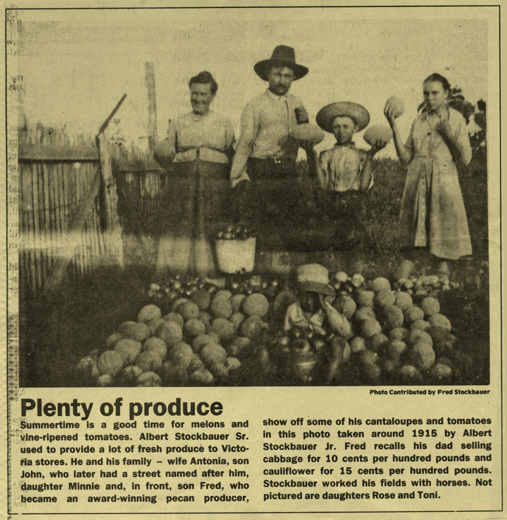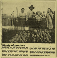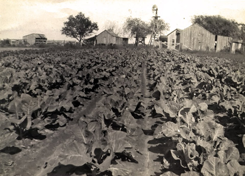 Ferdinand and Anna Pribyl farm in Victoria, Texas on Beck Road. | Rows of produce, for which the Jan Pribyl farm became known. Ferdinand's nephew, Albert Stockbauer, took over the farm and became a well known vegetable producer in Victoria. | ||