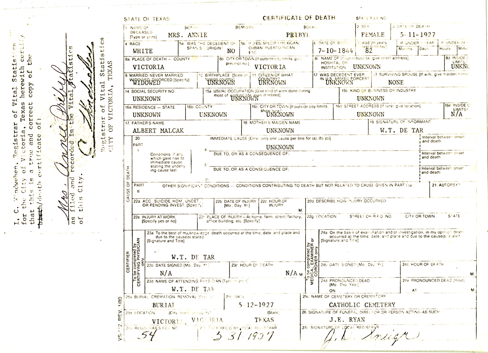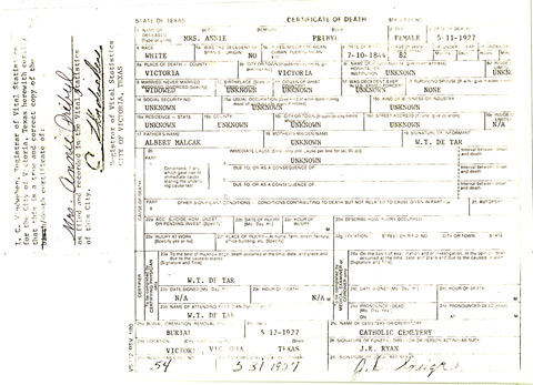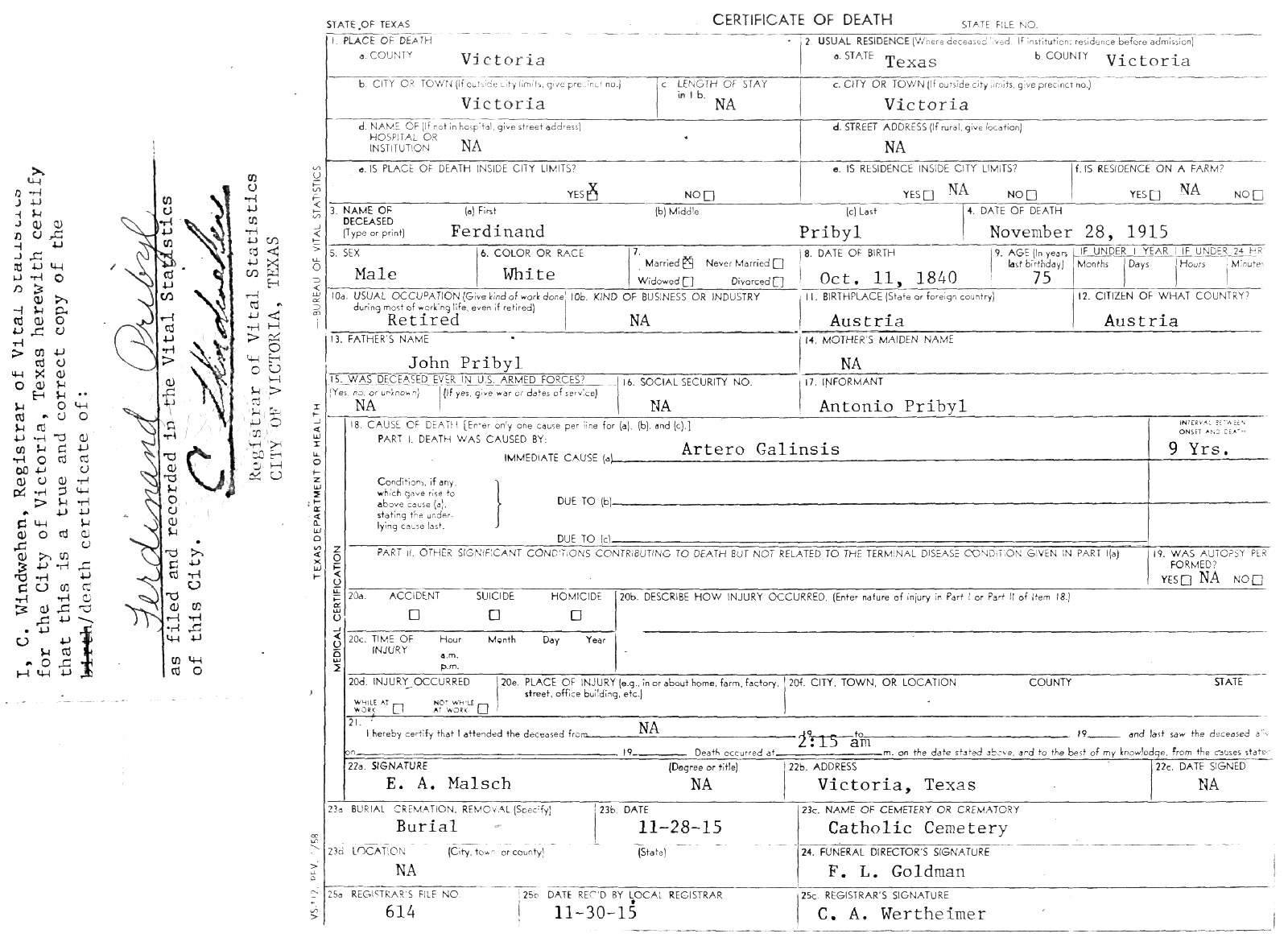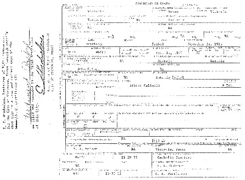 Ferdinand Pribyl Death Certificate – Nov. 28, 1915 | Anna Pribyl Death Certificate – May 11, 1927 | ||