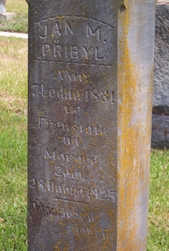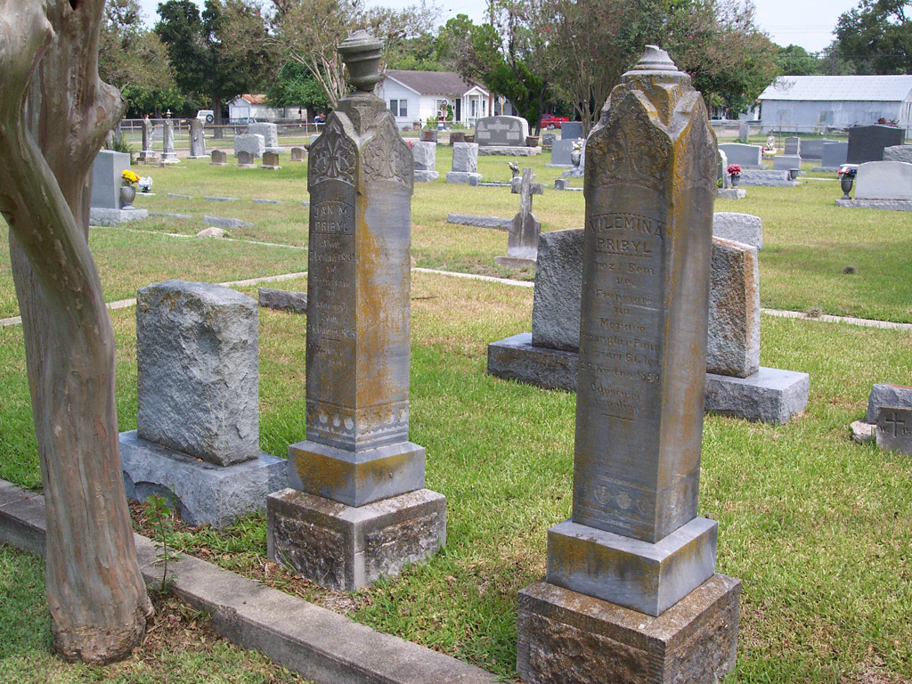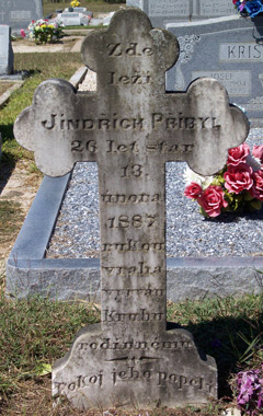 Inscription reads, "Here lies Jindrich (Henry) Pribyl, 26 years old, Feb. 13, 1887. Died by the hand of the murderer. Pulled from the family circle. Peace to his ashes." | Jan & Wilhelmina Pribyl Headstones located in the Catholic Cemetery in Victoria, Texas. | Inscription on Jan's tombstone. |
