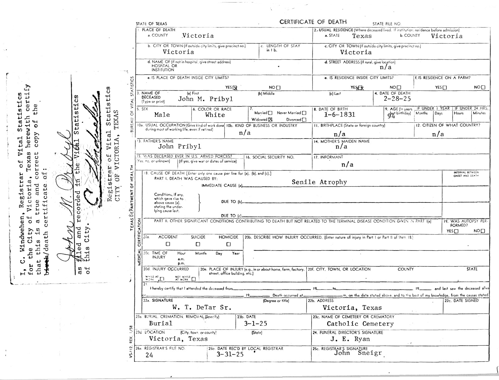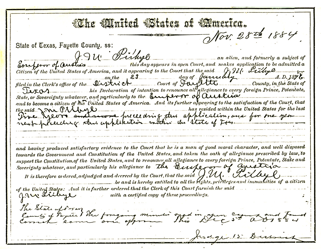 John M. Pribyl Naturalization Certificate – Nov. 28, 1884 | John M. Pribyl Death Certificate – Feb. 28, 1925 | ||
